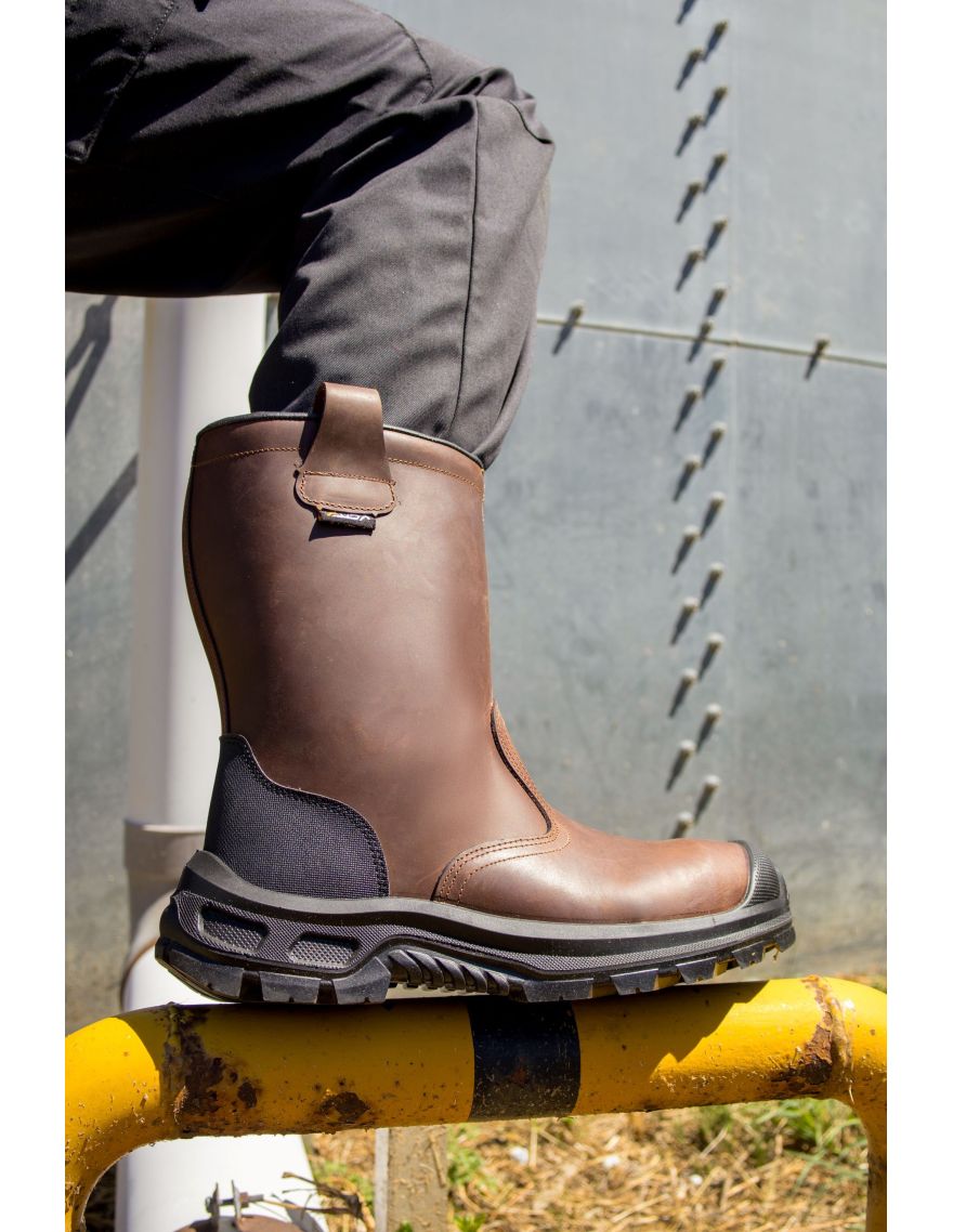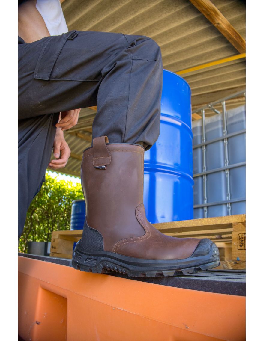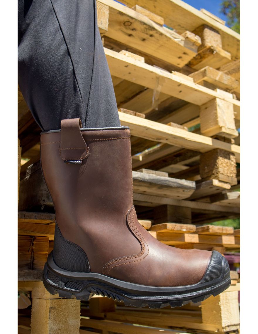 Sa tige en cuir pleine fleur hydrofuge finition pull-up assure une imperméabilité, sans traversée d’eau après 7 heures de test. Un insert anti-abrasion au talon et un sur-embout pare-pierre en polyuréthane (SC) renforcent la solidité de la chaussure, avec une résistance aux chocs et à l’abrasion, conformément à la norme EN ISO 20345:2022.